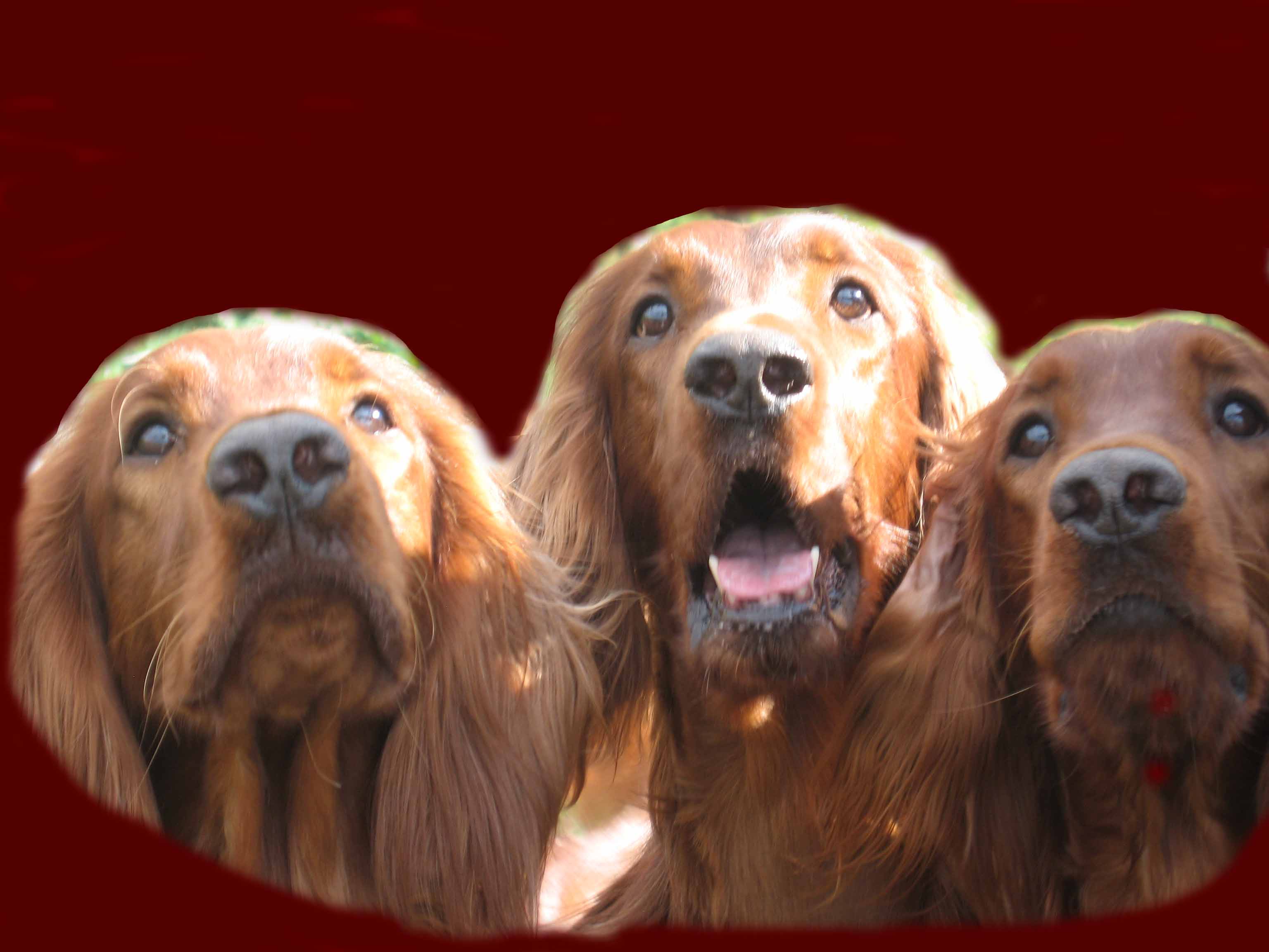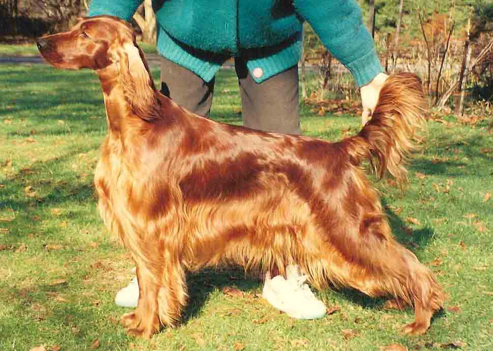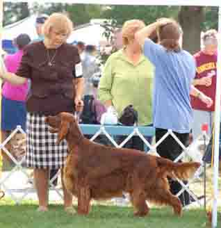 During those years we learnt to appreciate the work of the American breeders who focused on a balanced and elegant conformation, lively movement, nice temperaments and good health. Across the Atlantic, we found lots of sound and balanced but stylish Irish Setters, with nice coat, good bone, nice front and rear angulation and large movement with good reach and drive. Irish Setter is a breed which is meant to move. We also found lovely and soft temperaments combined with the typical happy and rollicking Irish personalities. And we do appreciate the attention given to the health of the Irish Setters in breeding programs. We do not hunt birds ourselves but rather enjoy observing them. However it is good to see how birdy the bloodlines of this pointing breed remain, even if most Irish are today bred to become companion dogs. At the annual Irish Setter National Show in Oklahoma City in May 2011, birds took the liberty of landing right in the show rings. Every single Irish that we saw reacted to the birds. This did not make the handlers' job too easy. In a Finnish dog show 2015, one of our young Irish kept pointing a hair ball, brought by the wind right into the show ring from a neighbouring Afghan show site.